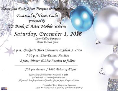 Celebrate the 29th Festival of Trees and the holiday season at the Gala Evening, presented by US Bank & Astec Mobile Screens, on Saturday, Dec. 1 at Deer Valley Banquets in Deer Grove, IL. Enjoy a cocktail hour with silent auction items beginning at 6 p.m., followed by dinner with a live and dessert auction all benefitting hospice services in the Sauk Valley area. Tickets are $50/person or $400/table of eight. Reservation deadline is Friday, November 9. For more information, call (815) 625-3858 or visit www.hospicerockriver.org.